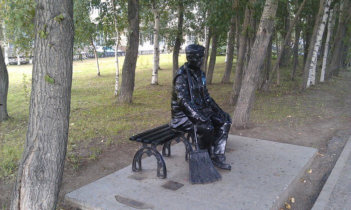 Дворника с метлой, сидящего на лавочке, прозвали «дадей Мишей». Чугунное изваяние весит около 300 килограммов, его отливали в Челябинске под руководством скульптора В. Тюсяева. Уставший дворник, который своим присутствием напоминает вартовчанам о чистоте, стал украшением одной из самых широких улиц Нижневартовска.